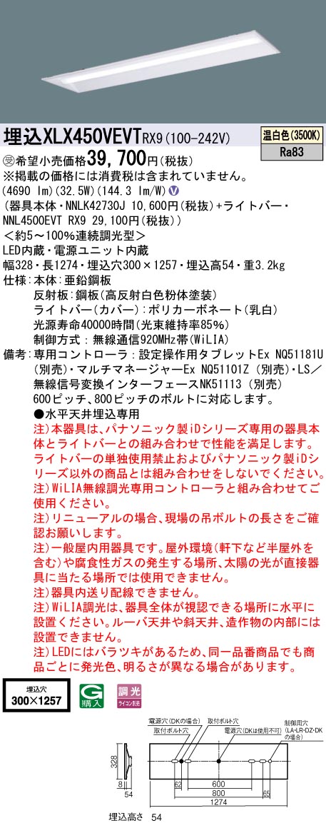 【代金引換不可】天井埋込型 40形 一体型LEDベースライト 連続調光型・調光タイプ(ライコン別売) 下面開放型 Hf蛍光灯32形定格出力型2灯器具相当/Hf蛍光灯63形定格出力型1灯器具相当 Hf32形定格出力型/Hf63形定格出力型・5200 lm(NNLK42730J+NNL4500EVTRX9)