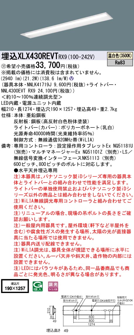 【代金引換不可】天井埋込型 40形 一体型LEDベースライト 連続調光型・調光タイプ(ライコン別売) 下面開放型 Hf蛍光灯32形高出力型1灯器具相当 Hf32形高出力型・3200 lm(NNLK41719J+NNL4300EVTRX9)