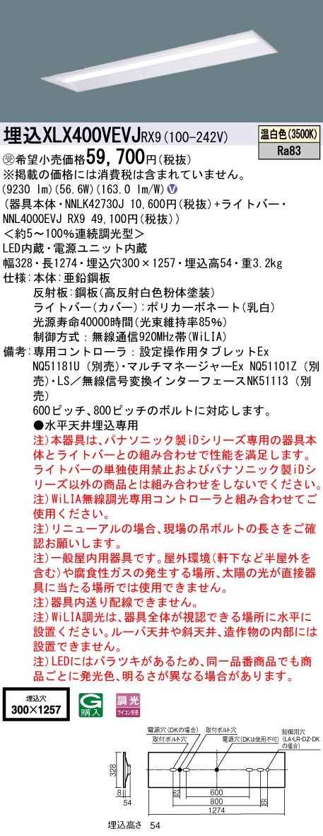 【代金引換不可】天井埋込型 40形 一体型LEDベースライト 連続調光型調光タイプ(ライコン別売) 下面開放型 Hf蛍光灯32形高出力型3灯器具相当/Hf蛍光灯63形定格出力型2灯器具相当 Hf蛍光灯32形高出力型/Hf蛍光灯63形定格出力型・10000 lm(NNLK42730J+NNL4000EVJRX9)