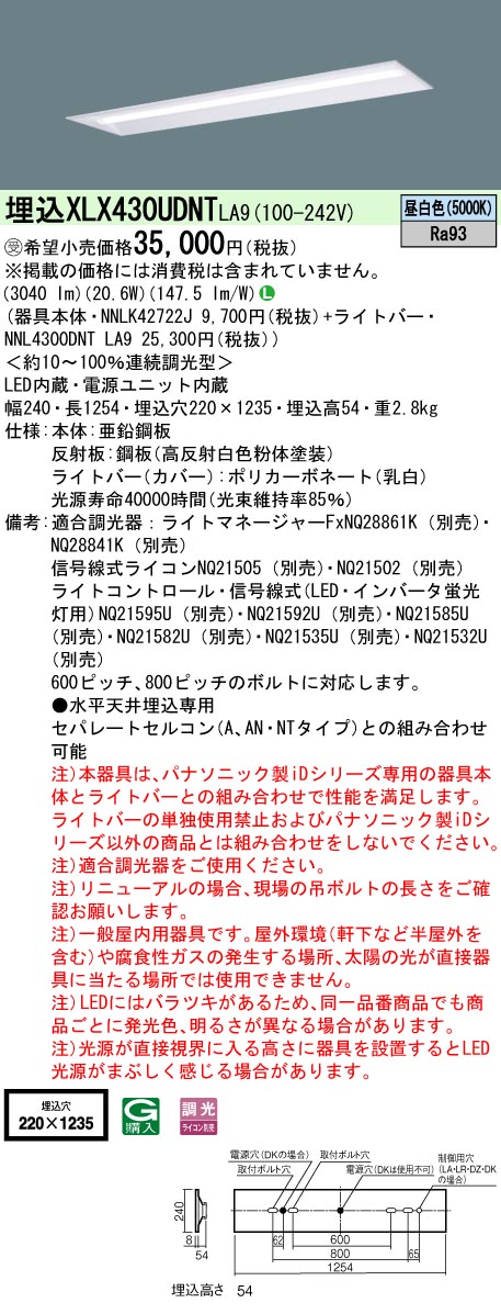 【代金引換不可】天井埋込型 40形 一体型LEDベースライト 連続調光型調光タイプ(ライコン別売) 下面開放型 Hf蛍光灯32形高出力型1灯器具相当 Hf32形高出力型・3200 lm(NNLK42722J+NNL4300DNTLA9)