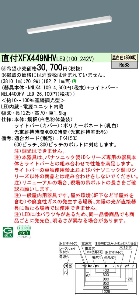 【代金引換不可】リニューアル用 天井直付型 40形 一体型LEDベースライト 連続調光型 iスタイル/ストレートタイプ/笠なし型 直管形蛍光灯FLR40形2灯器具相当 FLR40形2灯・4000 lm(節電)(NNLK41109+NEL4400HVLE9)