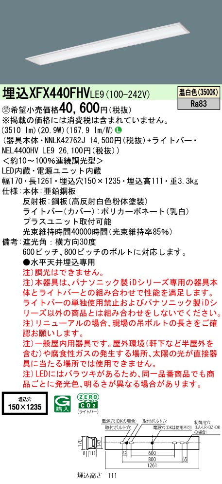 【代金引換不可】天井埋込型 40形 一体型LEDベースライト 連続調光型 フリーコンフォート/基本灯具 直管形蛍光灯FLR40形2灯器具相当 FLR40形2灯・4000 lm(節電)(NNLK42762J+NEL4400HVLE9)