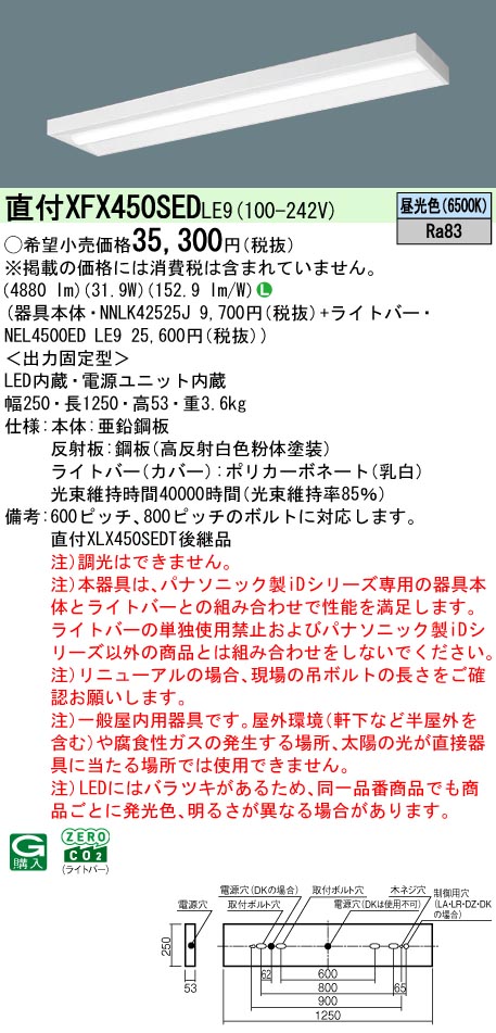 天井直付型 40形 一体型LEDベースライト スリムベース Hf蛍光灯32形定格出力型2灯器具相当/Hf蛍光灯63形定格出力型1灯器具相当 Hf32形定格出力型2灯/Hf63形定格出力型・5200 lm(NNLK42525J+NEL4500EDLE9)